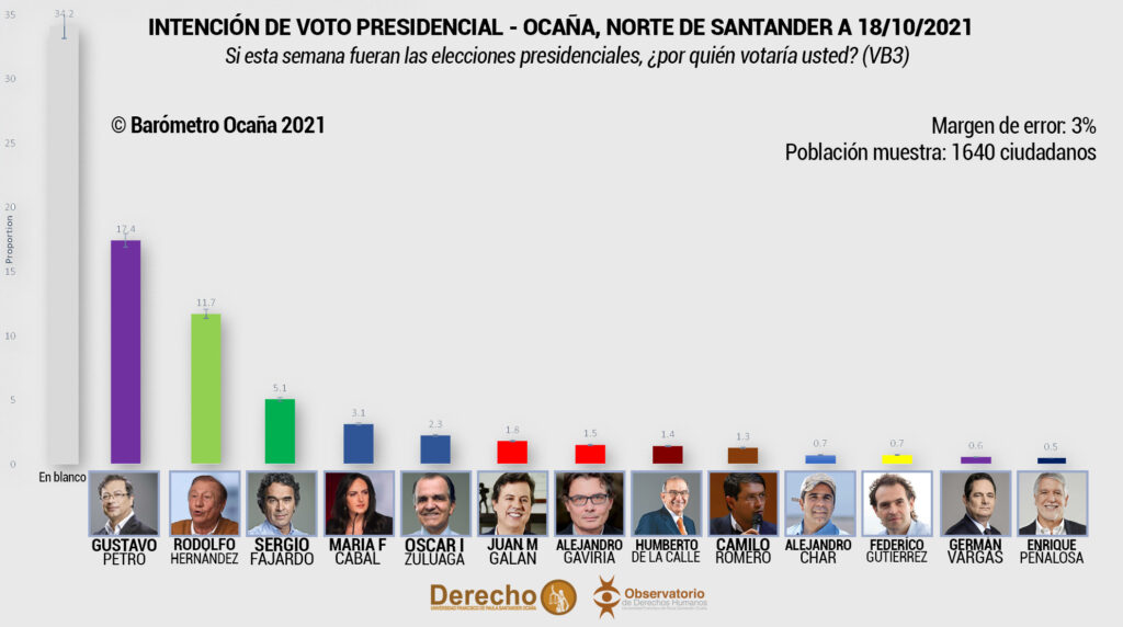 Como se observa, el voto en blanco supera al primer candidato con un margen significativo. Este grado de indecisión marca una tendencia política que se puede sumar al 24% de los ocañeros que considerarían en teoría no votar en estas elecciones o el 34% de ellos que lo harían en la modalidad “voto de castigo”, es decir, solo si su voto supone una sanción política al gobierno actual.