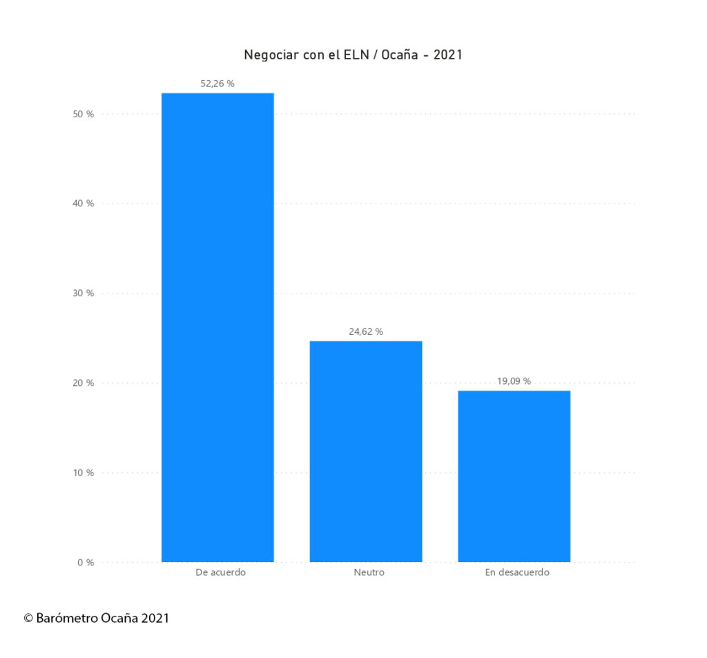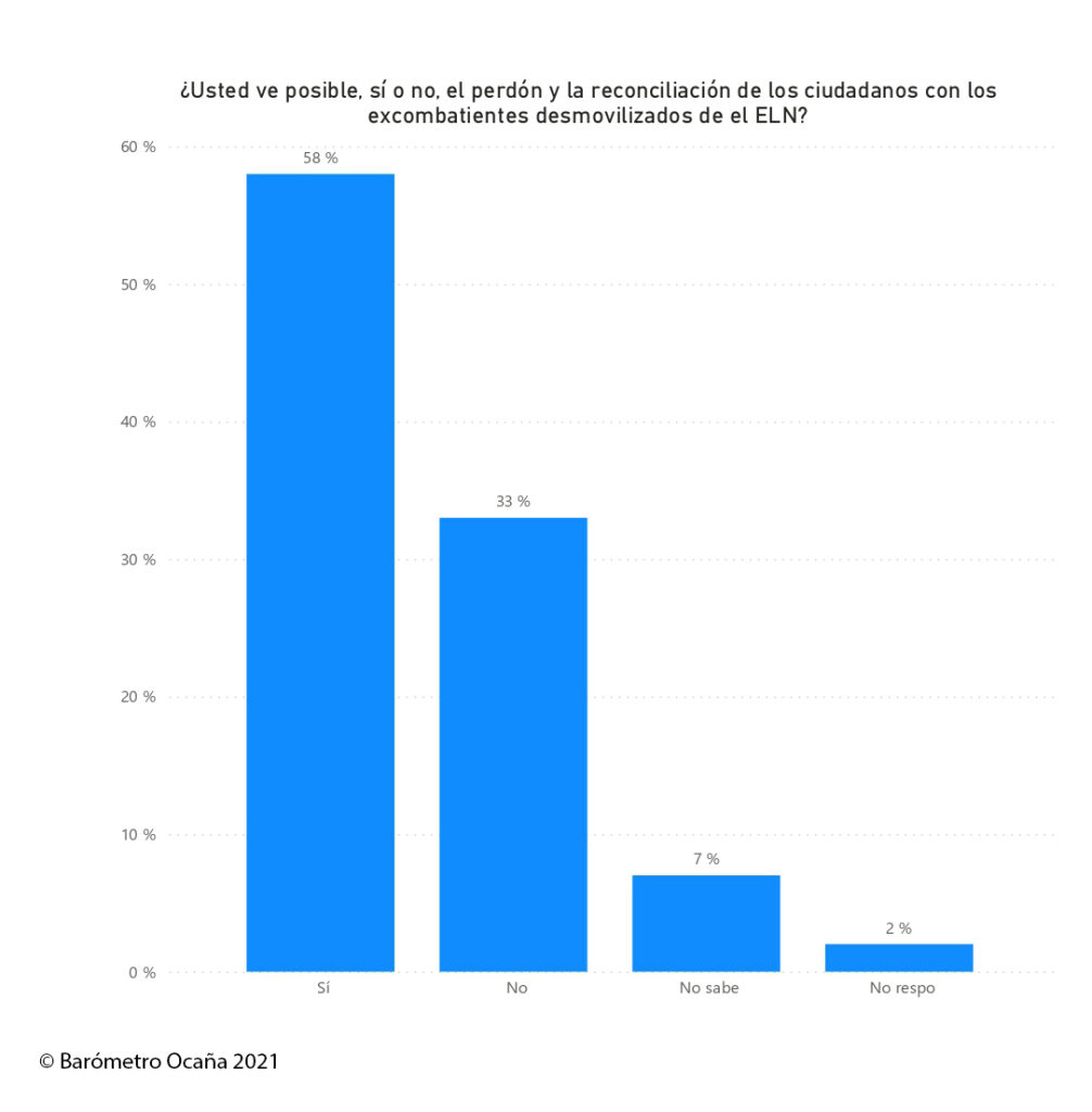 A través del Barómetro Ocaña 2021 se consultó a los ocañeros su opinión acerca de la posibilidad de negociar un acuerdo de paz con el ELN y su percepción acerca de si es posible reconciliarse con miembros de este grupo armado. Sus respuestas fueron procesadas estadísticamente a través de las siguientes imágenes: