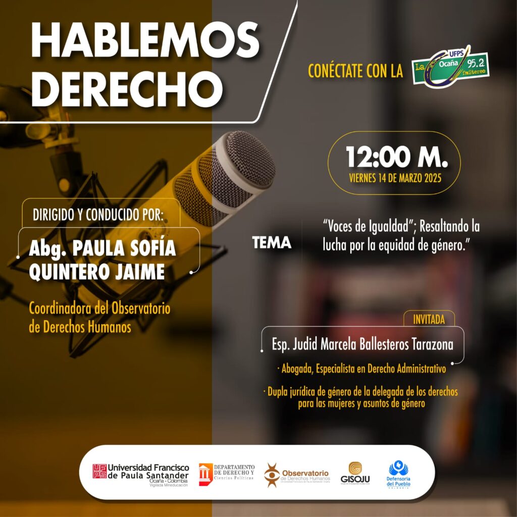 No te pierdas una nueva emisión de nuestro programa radial “Hablemos Derecho” con un tema relevante “Voces de igualdad”, Resaltando la lucha por la equidad de género. Será transmitido el día de hoy 14 de marzo de 2025 a las 12 del mediodía por la U FM STEREO 95.2.